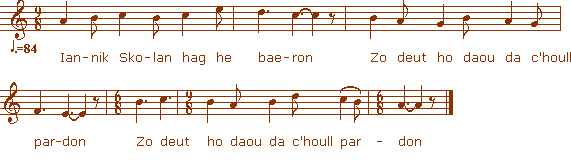 Le sujetJean Scolan Jean Scolan et son parrain Sont venus tous les deux demander pardon ; Demander le pardon de Dieu, Et rémission pour leurs âmes. En arrivant chez sa mère, Il lui a dit : - Bonne nuit et joie à tous dans cette maison ; Est-on allé se coucher ici ? - - Qui est là, à cette heure de la nuit, Quand je repose dans mon lit ? - - Levez-vous, ma mère, pour souffler le feu, Et vous verrez deux, au lieu d'un. - Quand elle eut allumé la chandelle, Elle tomba trois fois à terre. - Calmez-vous, ma mère, ne vous effrayez point, En voyant le fils que vous avez mis au monde. Je viens du feu du purgatoire, Et je vais au feu de l'enfer ; Je vais briller dans le feu de l'enfer, Si vous ne voulez me pardonner. Je suis venu demander le pardon de Dieu, Et la rédemption de mon âme. - - Et pomment te pardonner, mon fils ? Songe à tout le mal que tu m'as fait ! Tu as tué ton père, pendant qu'il dormait, Et violé trois de tes soeurs ! - - Puisque Dieu m'a pardonné, Ma mère, pardonnez-moi aussi ! Ma mère, je sais bien que je l'ai fait, Hélas ! par malheur et par méchanceté ; Mais puisque Dieu m'a pardonné, Ma mère, pardonnez-moi aussi ! - Et comment, mon fils, te pardonner ? Songe à tout le mal que tu m'as fait ! Mettre le feu à neuf meules de blé, Et me forcer à aller mendier mon pain ! Ma mère, je sais bien que je l'ai tait, Hélas ! par malheur et par méchanceté ; Mais puisque Dieu m'a pardonné, Ma mère, pardonnez-moi aussi ! - Et comment, mon fils, te pardonner ? Songe à tout le mal que tu m'as fait : Tu as mis le feu au fournil, Et brûlé sept bêtes à cornes ! - - Ma mère, je sais bien que je l'ai fait, Hélas ! par malheur et par méchanceté ! Mais puisque Dieu m'a pardonné, Ma mère, pardonnez-moi aussi. - Comment, mon fils, te pardonner ? Songe à tout le mal que tu m'as fait : Tu as volé la ceinture à Guingamp, Le chapelet et la croix d'argent ! - - Ma mère, je sais bien que je l'ai fait, Hélas ! par malheur et par méchanceté ; Mais puisque Dieu m'a pardonné, Ma mère, pardonnez-moi aussi ! - - Comment, mon fils, te pardonner ? Songe à tout le mal que tu m'as fait : Songe à tout le mal que tu m'as fait, Tu m'as perdu mon petit livre ! Ce n'est pas encore mon livre que je regrette le plus, Mais mon chapelet, qui s'y trouvait ! - - Consolez-vous, ma mère, ne pleurez pas, Votre petit livre n'est pas perdu ! Votre petit livre n'est pas perdu, Ouvrez votre armoire et vous le verrez ; Allez à votre armoire et vous le verrez, Avec trois feuilles effacées ; Une par l'eau, une autre par le sang, Et la troisième par les larmes de mes yeux ! - Elle a ouvert son armoire, Et se retournant vers son fils Jean - Retire-toi loin de moi, Va-t'en brûler dans les feux de l'enfer ! - - Puisque Dieu m'a pardonné, Ma mère, pardonnez-moi aussi ! - Même thème que Yannig Skolan, dans le Barzaz Breiz